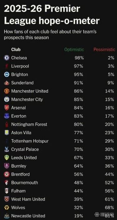 英超球迷乐观度排行